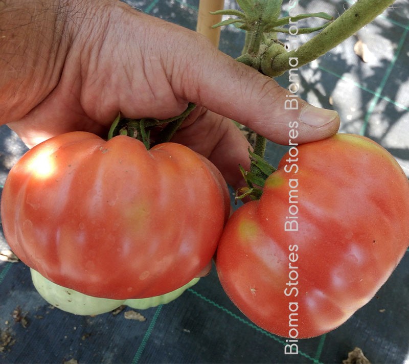 Σχηματίζει μεγάλους καρπούς (έως 500 γρ.). Κατά την πλήρη ωρίμανση, η φλούδα τους έχει ροζ χρώμα, με κίτρινους ”ώμους”. Το σχήμα τους είναι πεπλατυσμένο, με εγκολπώσεις κατά μήκος του καρπού.