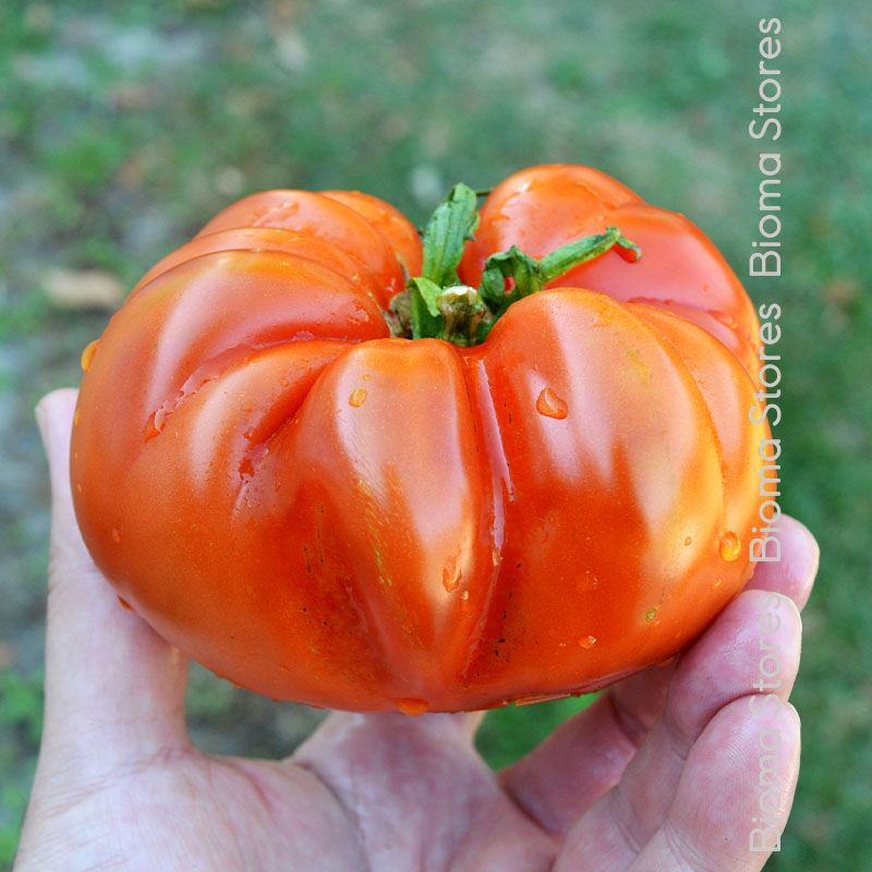 Καρπός μεγάλος, πεπλατυσμένος, με έντονες αυλακώσεις κατά μήκος, κόκκινου – ροζ χρώματος.