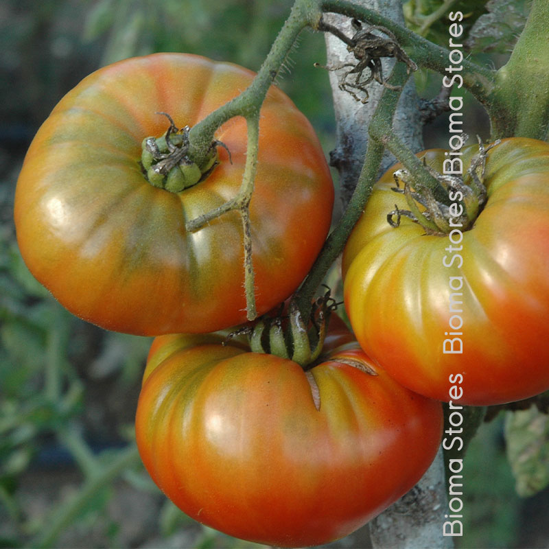 Σχηματίζει μεγάλους καρπούς, κόκκινου – ροζ χρώματος με πράσινα στίγματα στους ”ώμους”. Το μέσο βάρος τους είναι 200 – 300 γρ. και το σχήμα τους στρόγγυλο – ελαφρά πεπλατυσμένο, με εγκολπώσεις.